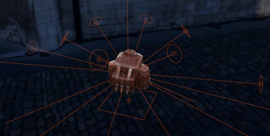 The lowpoly mesh with the PBR maps applied to it. Lights and a background HDRI create the setup necessary to rebake everything again, this time to create a single diffuse texture.