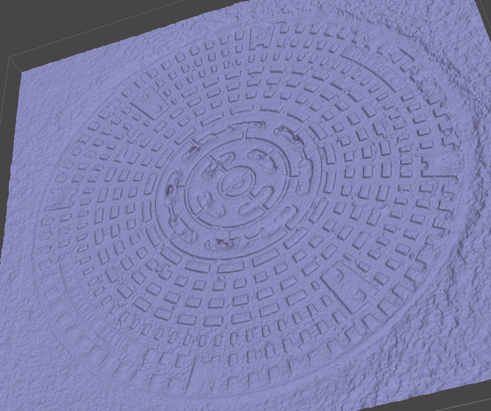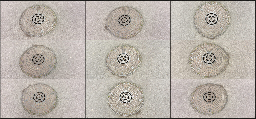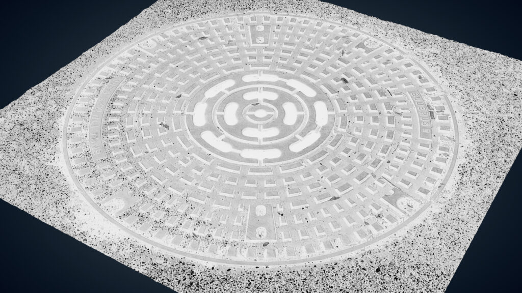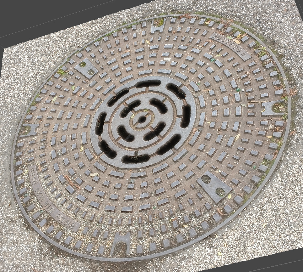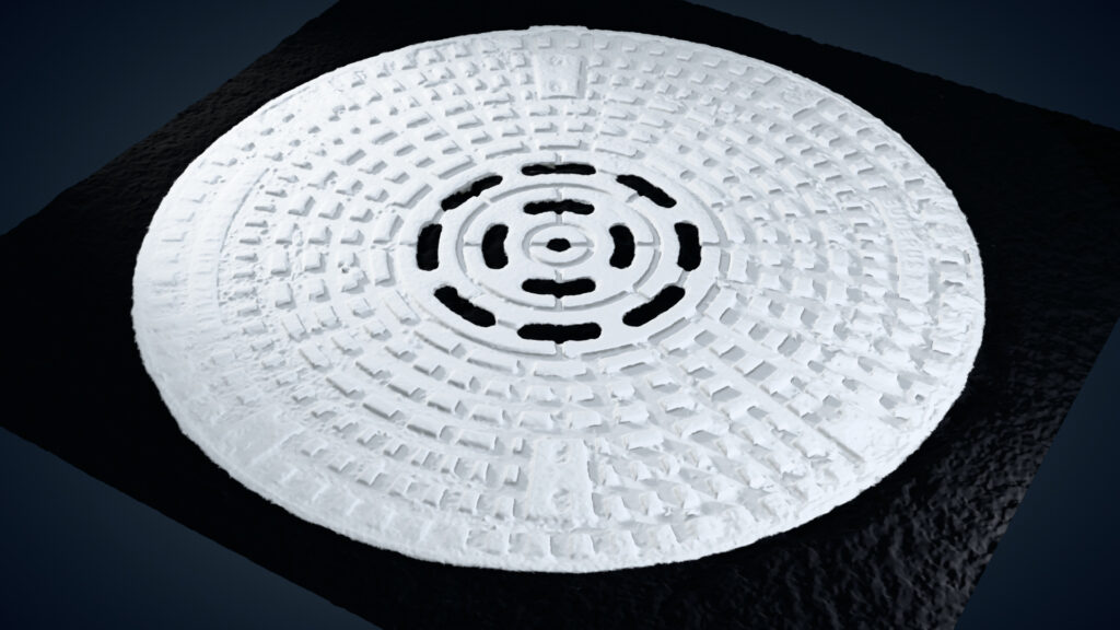 This manhole cover PBR material was created in Agisoft Metashape and Blender. I started by taking various pictures of a manhole cover that I found while I was on a walk. The lighting was not ideal, because the sun caused reflections on the metal depending on the view angle. If possible, you should take photogrammetry pictures on an overcast day, because you don’t get any highlights, strong shadows or color tints. The final asset turned out better than expected though.