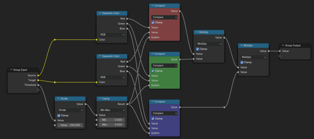 My diffuse texture is the Source color, the color picker is the Target. I split both into separate RGB channels and use a Compare node to compare each channel individually. The Epsilon value determines how high the threshold for comparison is. This value usually goes from 0.0 to 0.5, so I divided my input value by 200. This allows my to select a threshold from 0 to 100, which is easier to understand and edit.