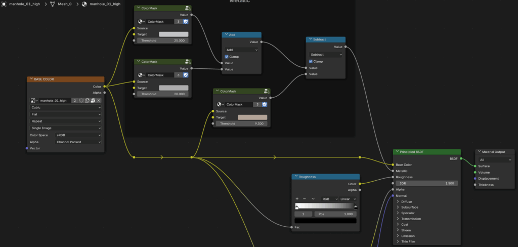 I created this mask by making a custom color mask node group. This group allows me to create a black and white mask from a picked color. This way I can add colors that I want and subtract colors that I don’t want. This is what the setup looks like: