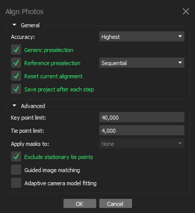 I simply added the photos via drag-and-drop into a new fresh Metashape project and aligned them via Workflow -> Align Photos. These were my settings: