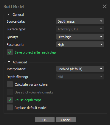 I then let Metashape generate the highpoly mesh via Workflow -> Build Model. I used the following settings: