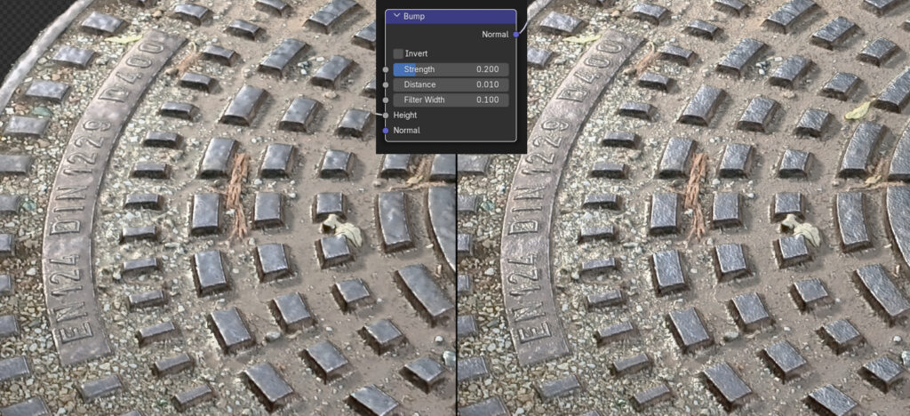 The normal map that will be generated by baking the highpoly mesh is already very heplful, but it lacks microdetails. To add more grain to it, I fed the highpoly’s texture into a bump node. On the following picture, you can see the highpoly. On the left without a normal map, and on the right with a normal map created by plugging the diffuse map in a bump node.
